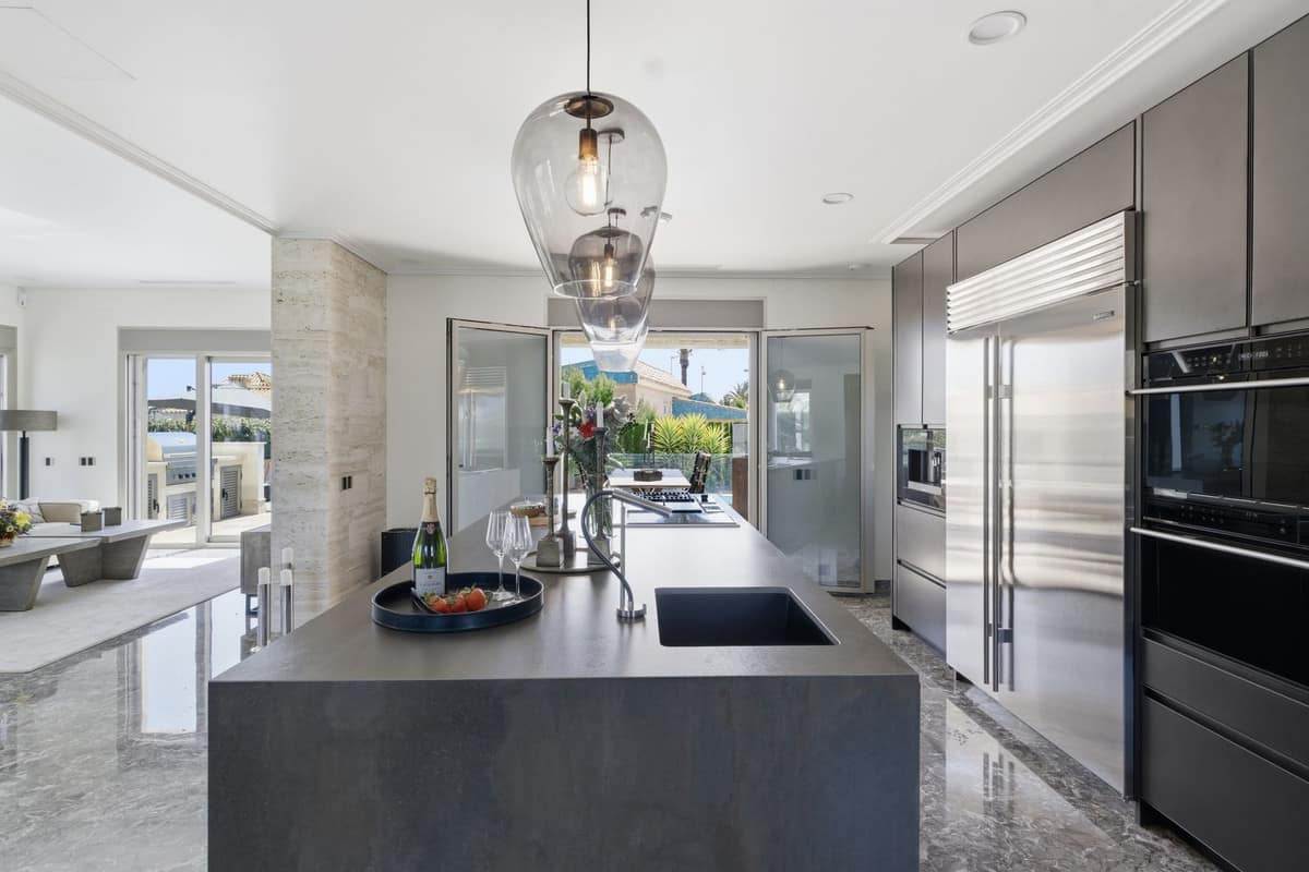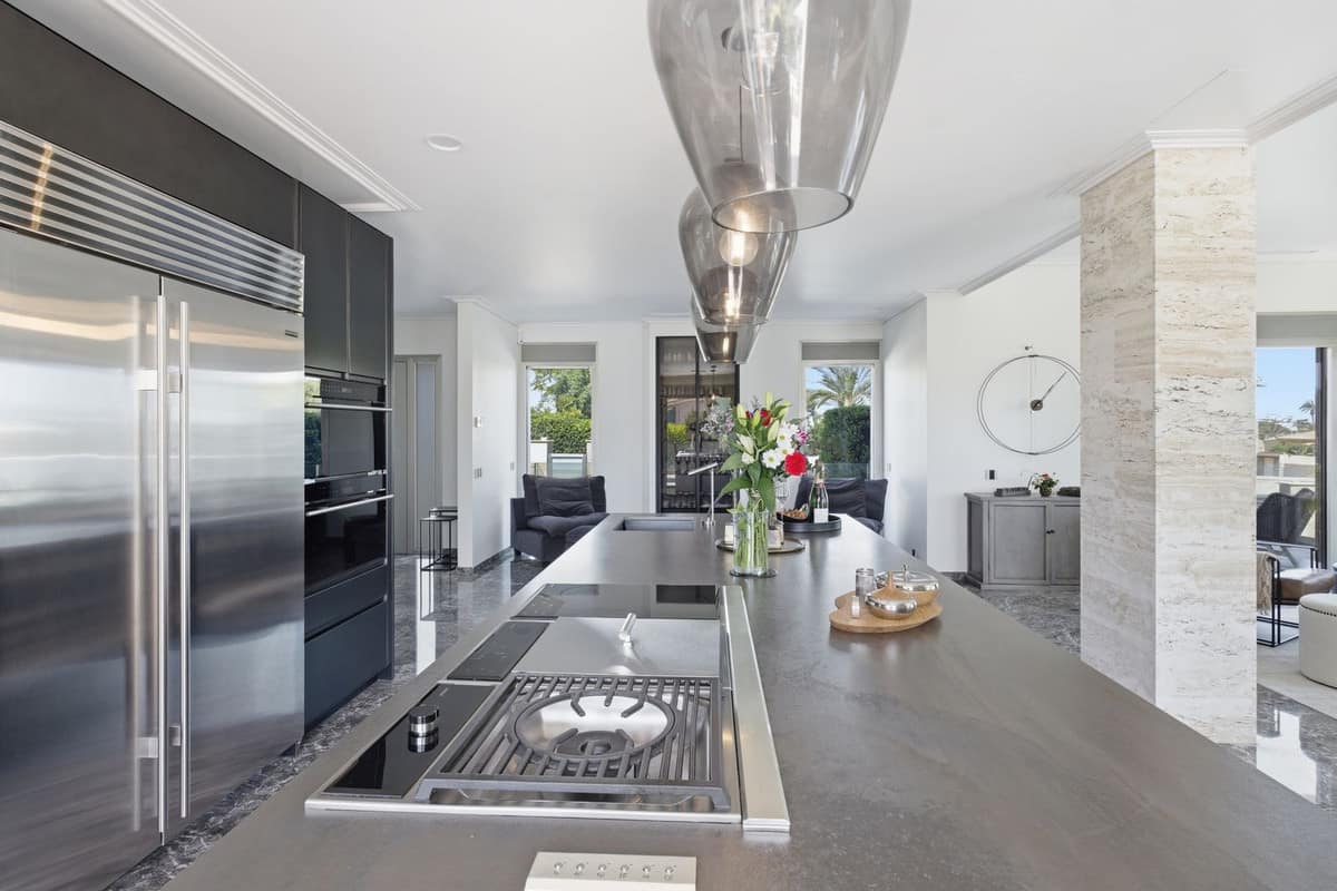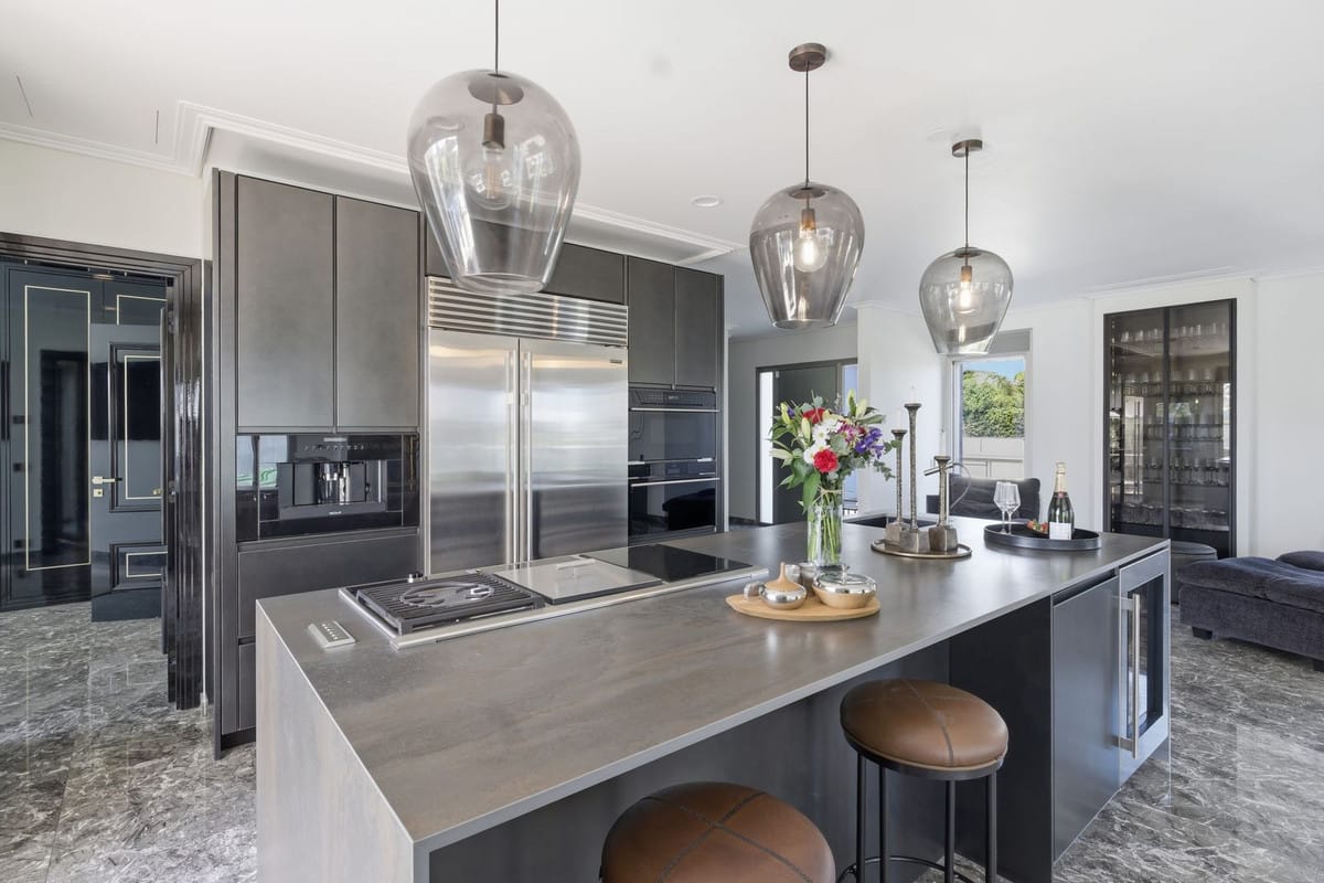 The open-plan living area is flooded with natural light through floor-to-ceiling windows and features a statement fireplace and a spectacular custom-designed luxury kitchen. Every detail has been carefully selected to create a seamless blend of elegance and functionality.